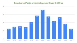 Met de patrijzen in het Ospelse zenderonderzoeksgebied zijn we terug bij af. Na twee slechte broedseizoenen op rij was de inschatting vorig jaar dat we blij mochten zijn als we nog 25 tot 30 broedparen overhielden in 2025. Het werden er 25. Wel iets meer juvenielen die het gered hebben dan vorig jaar door de droge zomer. We telden nu 47 vliegvlugge juvenielen bij 25 koppels tegen 30 juvenielen bij 37 koppels vorig jaar.