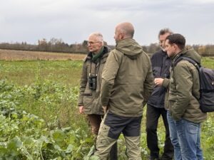 Deze aanpak vraagt minder bewerkingen en input, stimuleert het bodemleven en zorgt voor een sterke stikstofnalevering in de volgteelt. De bodemstructuur verbetert aantoonbaar en is in veel gevallen beter dan bij traditionele groenbemesters zoals gele mosterd. Daarnaast voegen we percelen graan toe die in de winter belangrijk voedsel bieden aan zaadeters. Muisrijke percelen trekken soorten aan zoals de blauwe kiekendief, die we tijdens de bijeenkomst zelfs nog zagen langsvliegen.