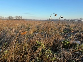 Een voorbeeld van kruidenrijke akkers waar bewerking het afgelopen jaar niet is uitgevoerd. Al heeft dit niet bewerken al positieve invloed op de bodem(fauna),toch mist hier nu in het winterhalfjaar voedsel en dekking voor de doelsoorten van het ANLb. Voor het komende seizoen zal hier aandacht met de inzaai nodig zijn om wel voor het zomerhalfjaar waarde te leveren voor broedvogels en hun voedsel.