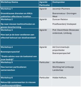 Daarnaast werden in interactieve workshops onder leiding van Jacomijn Pluimers en Harm Kossen concrete voorstellen uitgewerkt voor de inzet van dit bedrag. Prof. David Kleijn gaf inzicht in de verdienmodellen van natuurinclusieve landbouw, terwijl Ad Crommentuijn en Bjorn Kleinen uitlegden hoe Boerenperspectief boeren ondersteunt met onafhankelijk advies. Jan Kluskens deelde praktische tips voor samenwerking in particulier natuurbeheer en Hidde Hofhuis inspireerde deelnemers met adviezen om de biodiversiteit op hun land te vergroten.