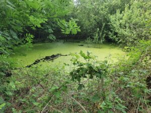 Voorbeeld van een grondwaterhoudende poel in Midden-Limburg die in een slechte staat is. De poel moet dringend vrij gezaagd en opgeschoond worden. Er is een dikke sliblaag aanwezig en de poel wordt sterk beschaduwd. Er zijn geen waterplanten meer aanwezig, alleen een dikke laag kroos.Dit is ongunstig voor het ecologisch functioneren van de poel.
