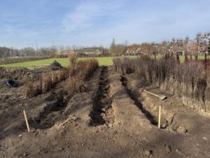 Naast het planten van ongeveer 11 kilometer knip- en scheerheggen en meer dan 4 kilometer struweelhagen, waarvan de aanleg komende week wordt afgerond, zullen we de komende tijd ook zo’n 400 fruit- en knotbomen planten. Daarnaast wordt dit jaar de aanleg van ongeveer 55 poelen en ruim 1500 m² aan graften en singels ingepland.